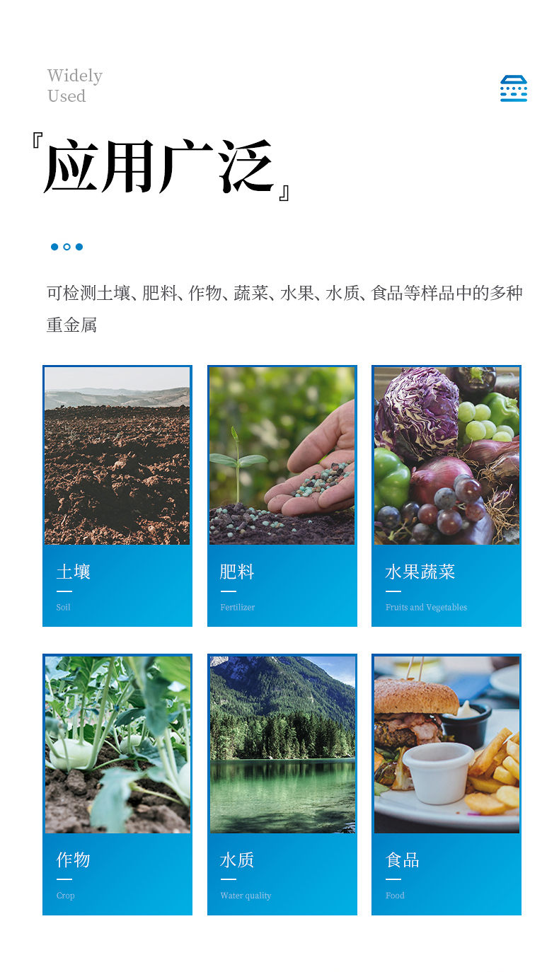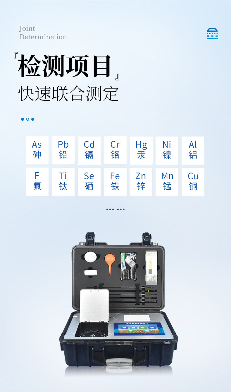 可對土壤、肥料、作物、蔬菜、水果、水質(zhì)、食品等樣品中的砷、鉛、鎘、鉻、汞、鎳、鋁、氟、鈦、硒、鐵、鋁、鋅、錳、銅等進(jìn)行快速聯(lián)合測定。